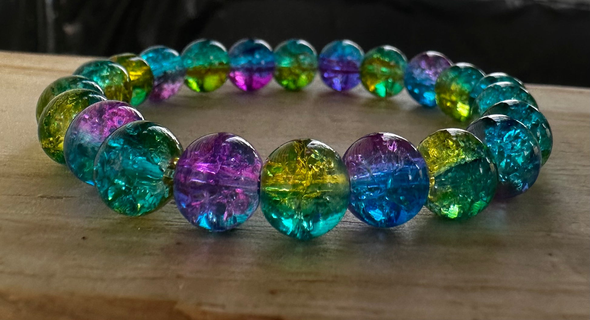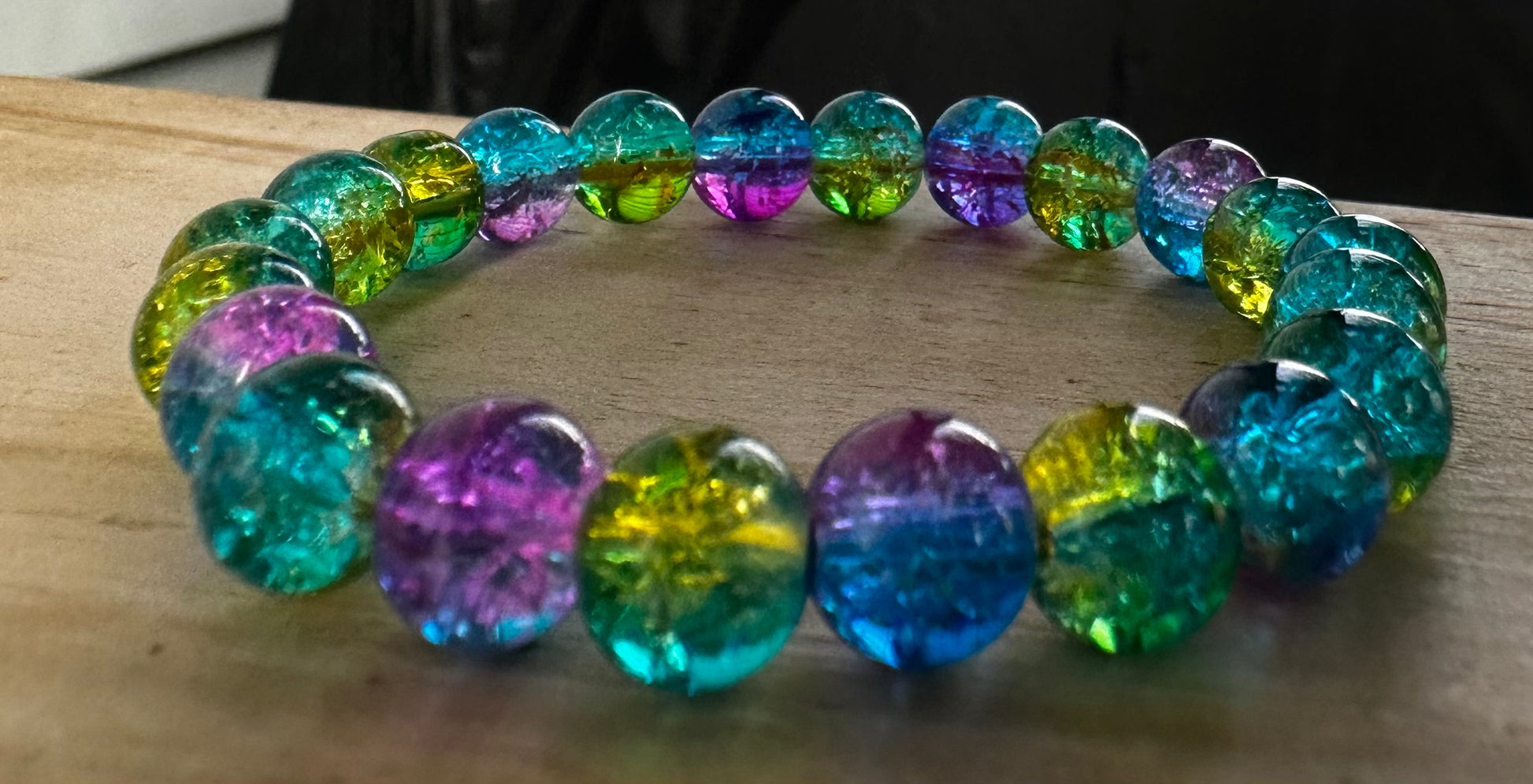 Shimmering like sunlight through ocean waves, this glass bead bracelet blends sea green, violet, soft yellow, and deep blue—echoing the colors of coral reefs and mermaid tails.