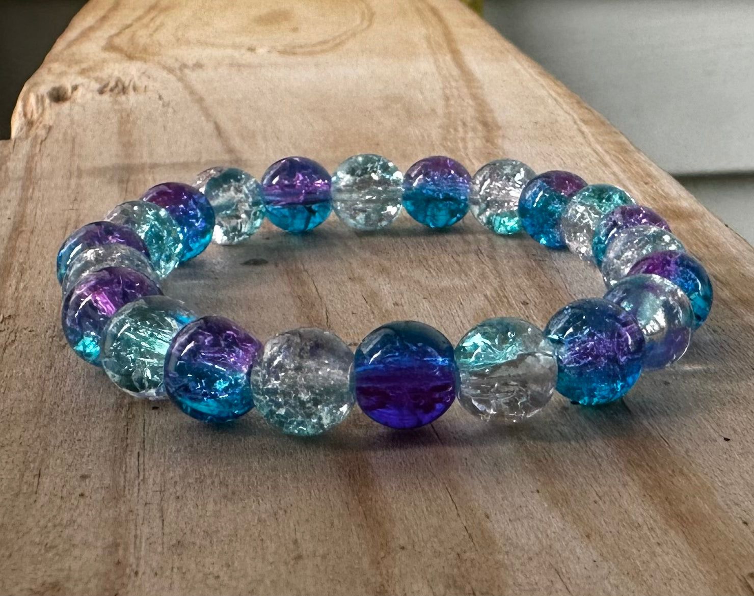 Dive into the deep and drift through the stars. The Galaxy bracelet features a radiant mix of light blue, indigo and violet glass beads—capturing the shimmer of distant galaxies.